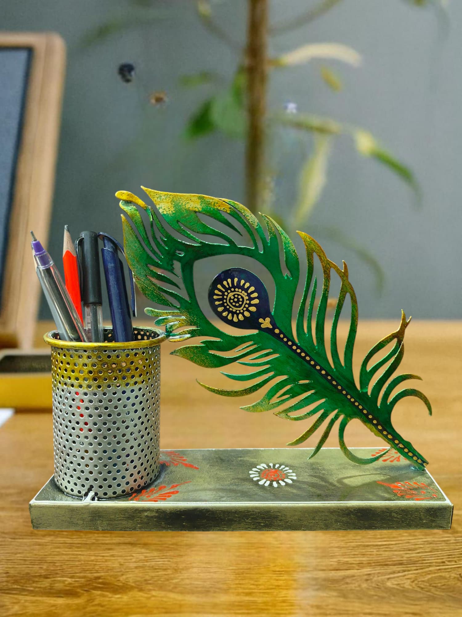 • Exquisite Hand-Painting: Every inch is meticulously decorated with vibrant floral motifs, white dotted accents, and a colorful feathered crown in shades of red, blue, and yellow.