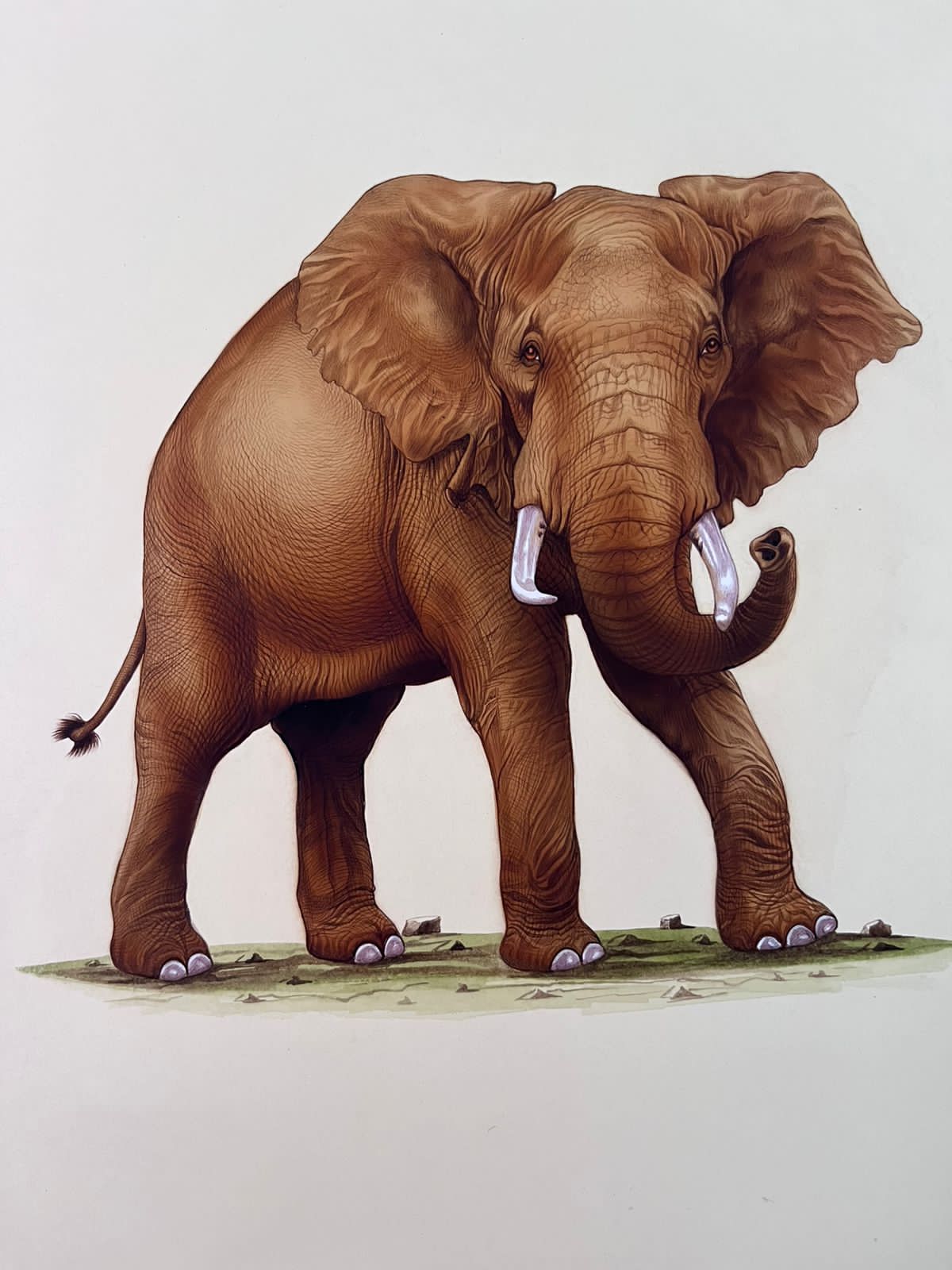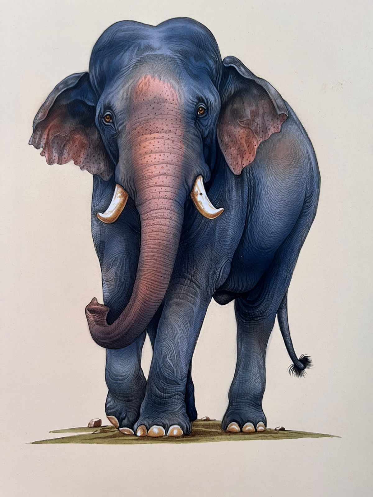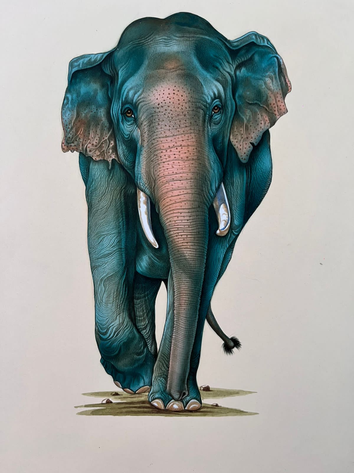 Vibrant Realism: The painting features a striking teal-blue elephant, detailed with realistic skin textures, expressive eyes, and soft pink highlights on the trunk and ears, symbolizing wisdom and power.