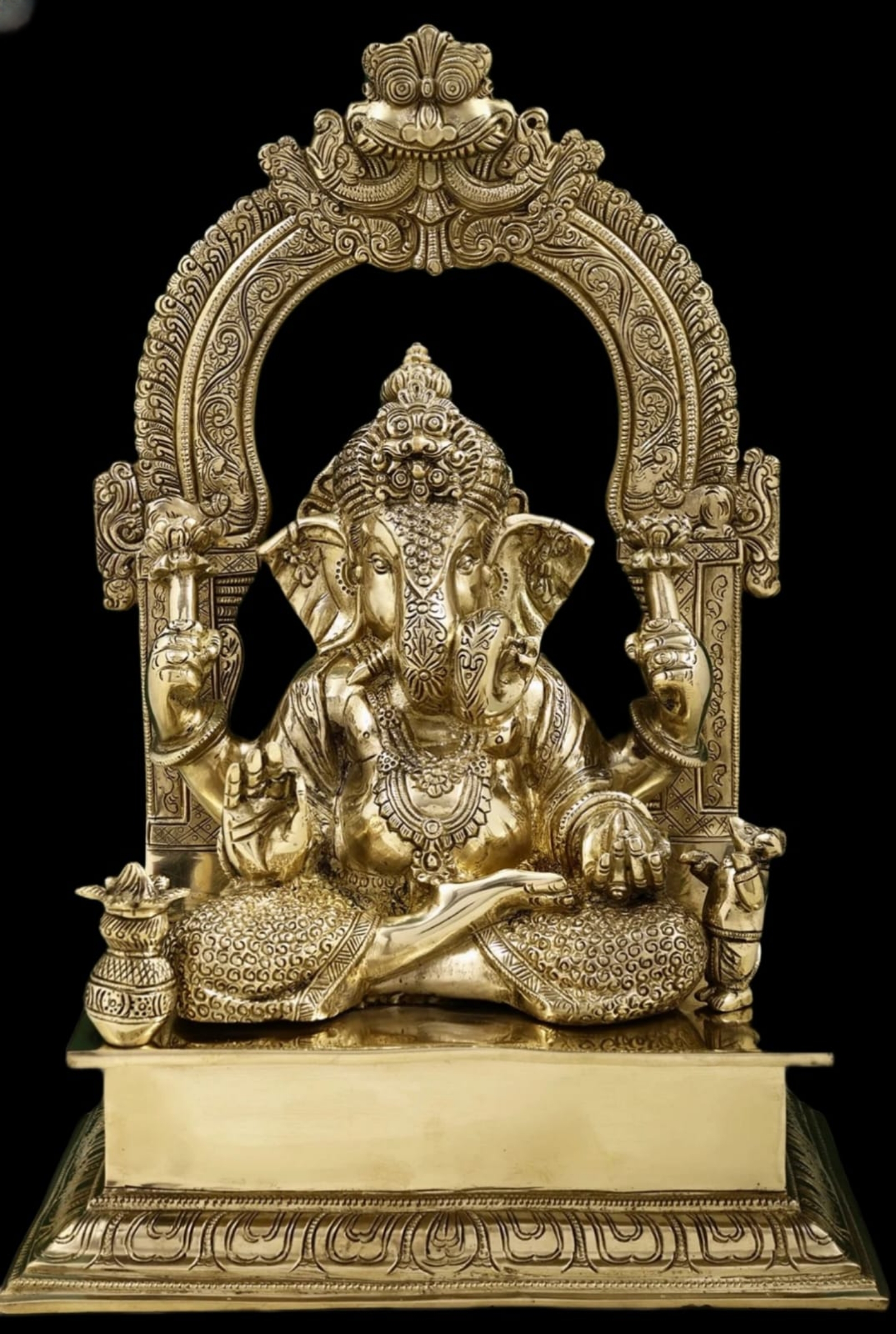 Sacred Symbols: A sacred Kalash (pot) is positioned on the left side of the pedestal, and Ganesha’s faithful mount, the Mushika (mouse), is carved in a devotional pose on the right.