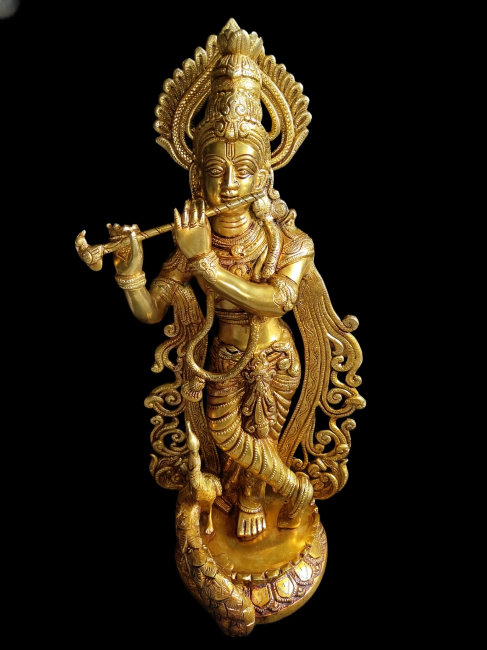 This magnificent handcrafted brass idol of Lord Krishna captures the deity in his most iconic and serene form, playing the flute to enchant all of creation.