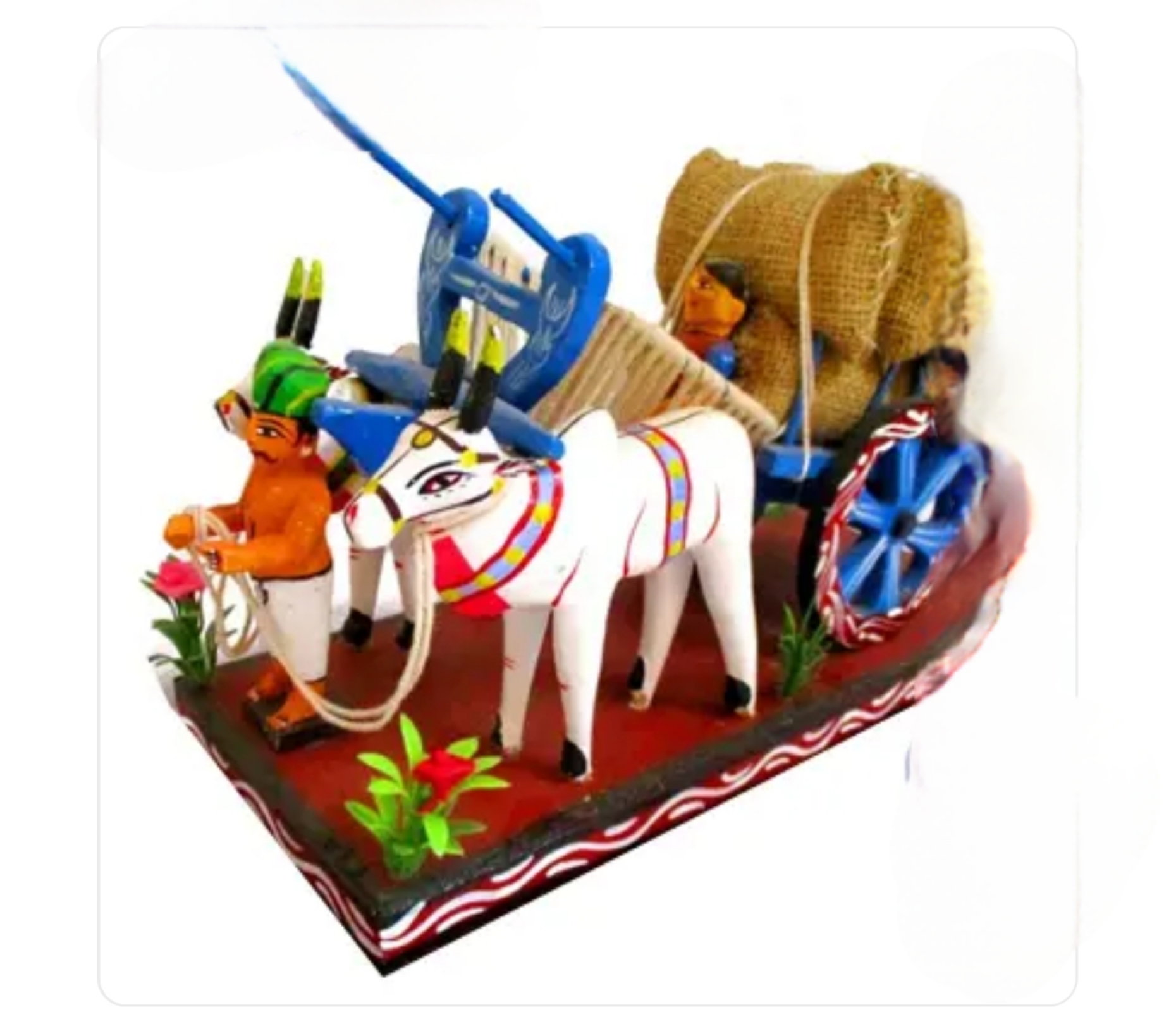 Intricate Details: This set features a driver leading a pair of beautifully decorated white bulls, pulling a cart laden with grain sacks, all mounted on a sturdy decorative base.