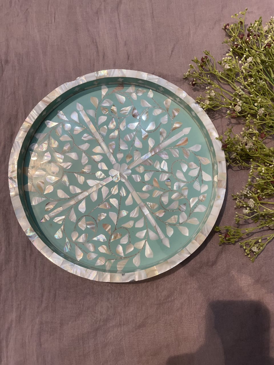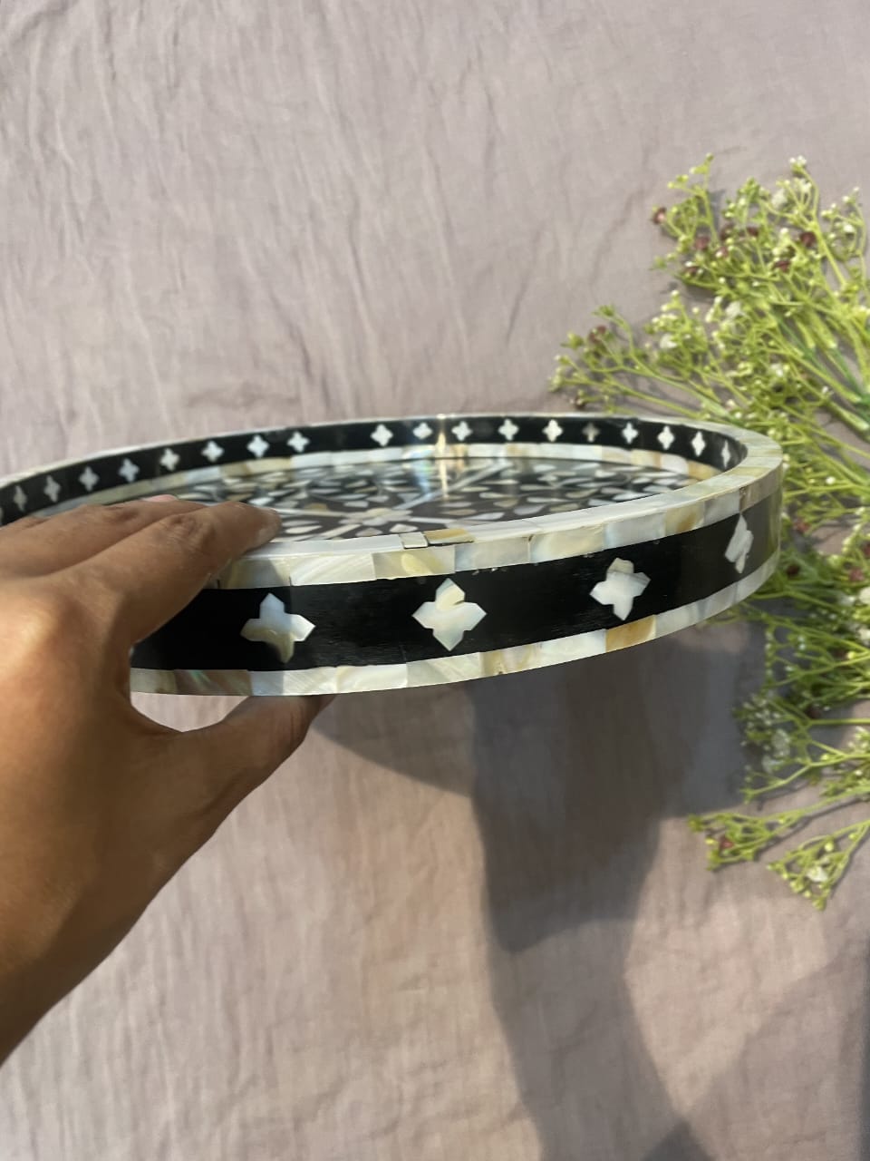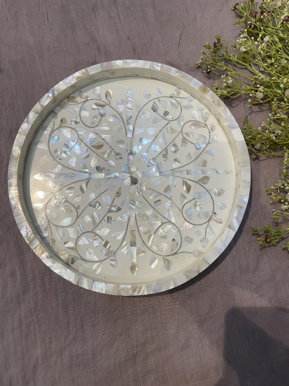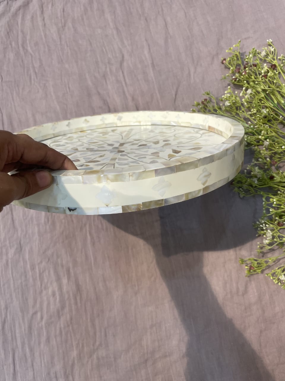 Premium Border Work: The round tray is framed by a continuous inlay border of larger Mother of Pearl tiles, providing a polished and structural finish to the artisan design.
