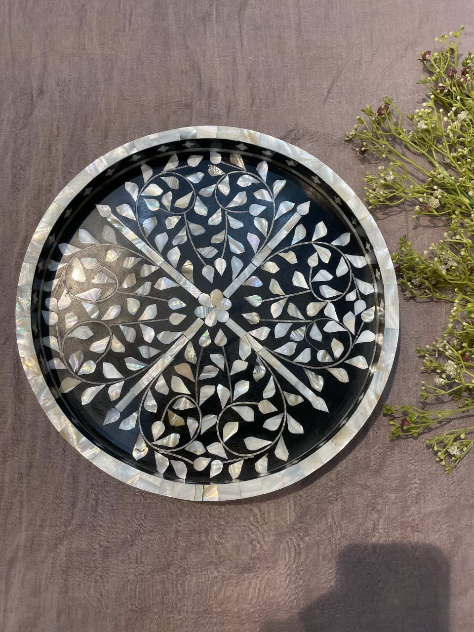 Exquisite Floral Inlay: The center of the tray features an intricate floral and vine motif, meticulously hand-set with genuine Mother of Pearl (Nacre) slivers against a sleek black resin background.
