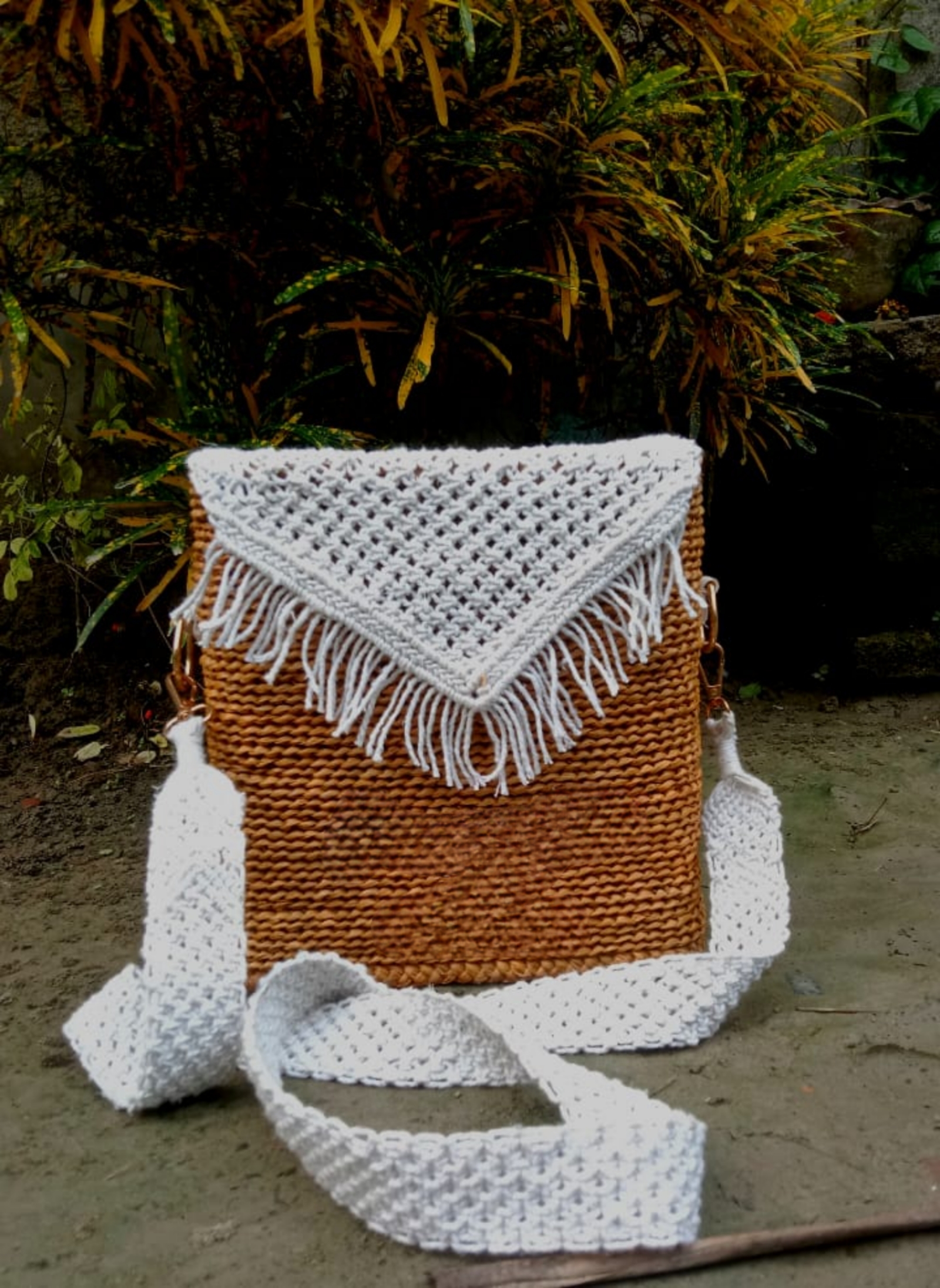 Macrame Accents: The purse features a beautiful white macrame flap designed with a triangular point and finished with soft, dangling fringe.