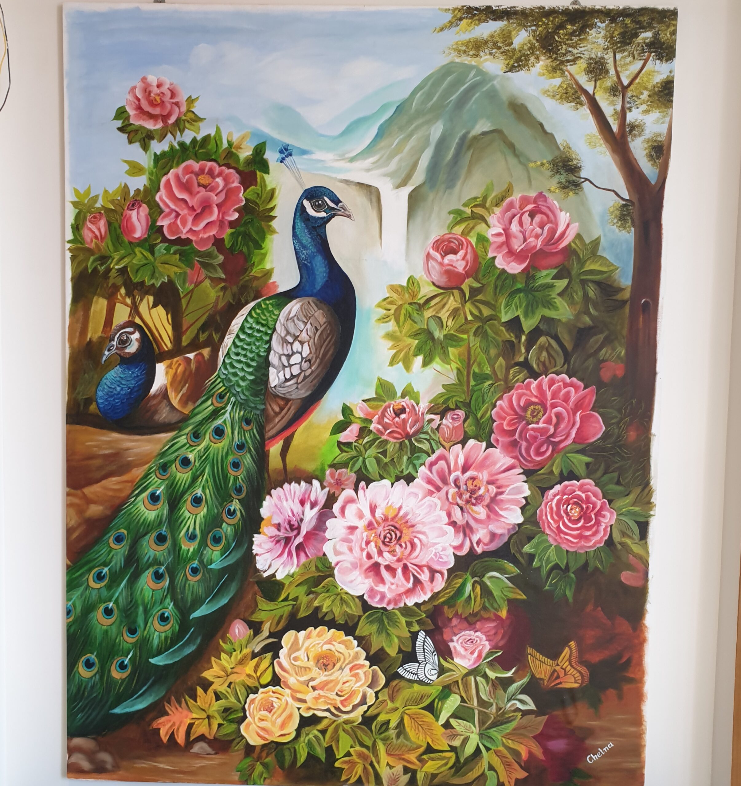 Rich Botanical Detail: The painting includes a variety of lifelike foliage, a smaller second peacock tucked away in the shadows, and delicate butterflies fluttering among the flowers.