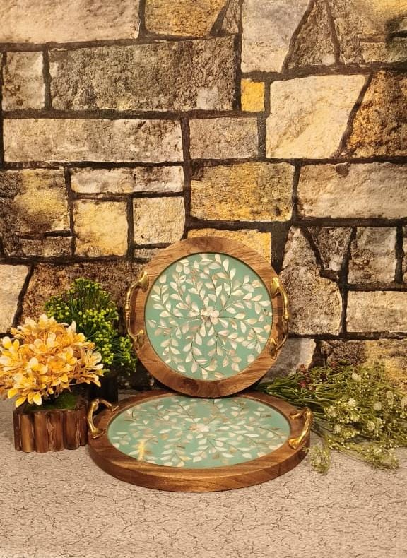Luxury Brass Handles: Each tray is equipped with ornate golden brass handles, securely attached to the wooden rim for a comfortable grip and a touch of regal elegance.