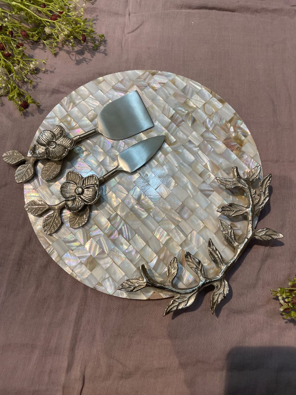 Premium Silver Finish: All metal components, including the serving tools and the branch accent, feature a burnished silver finish that complements the cool tones of the shell inlay.