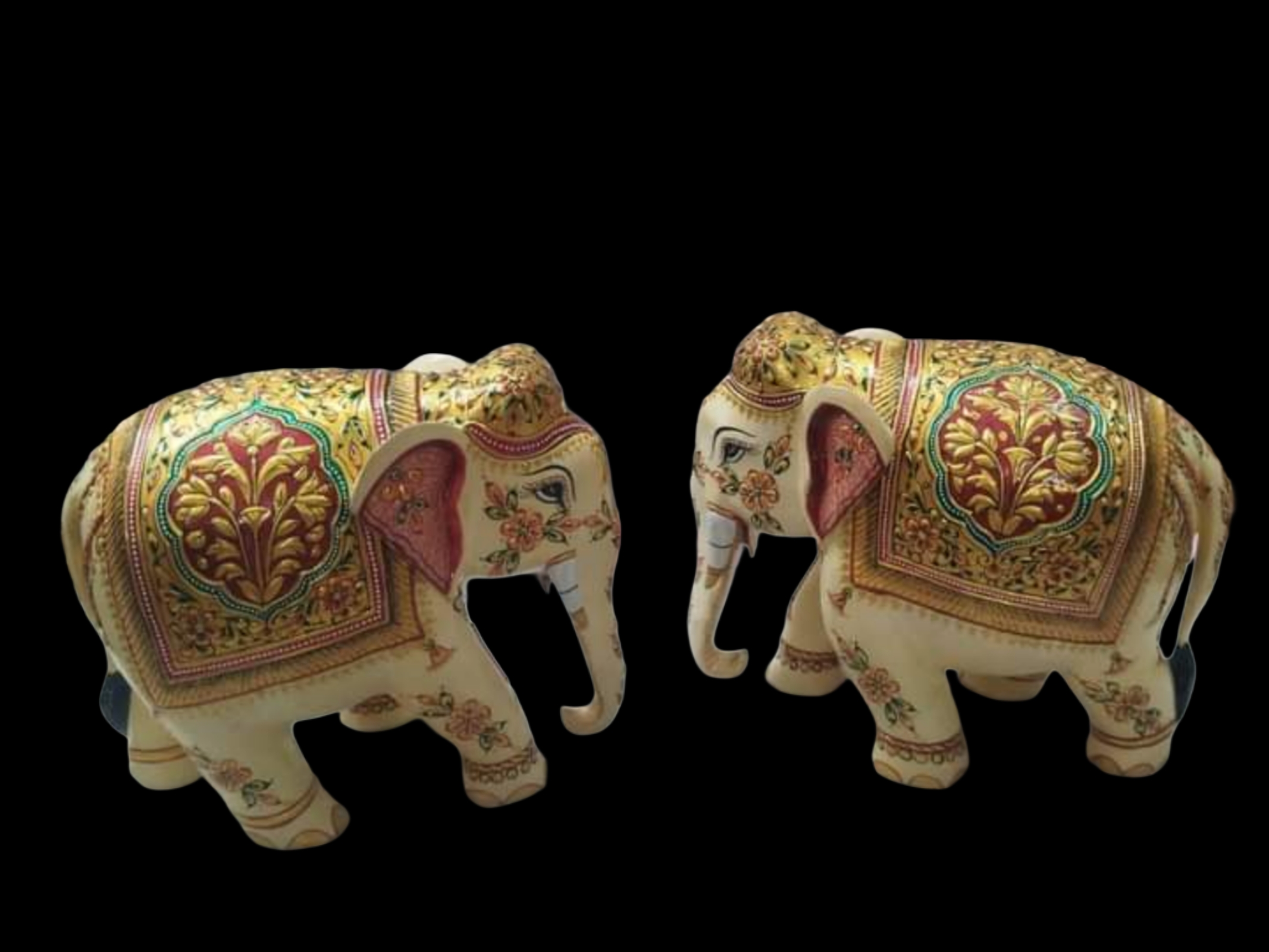 The elephants have a smooth, creamy or off-white base color, characteristic of marble, alabaster, or polished resin. They are highly ornamented with intricate, hand-painted details. The decorative “blankets” on their backs are the focal point, featuring rich colors like deep maroon/red and green, accented heavily with elaborate gold relief work and delicate floral motifs. Smaller floral paintings also adorn the face and ears. Both elephants have their trunks facing slightly downward.